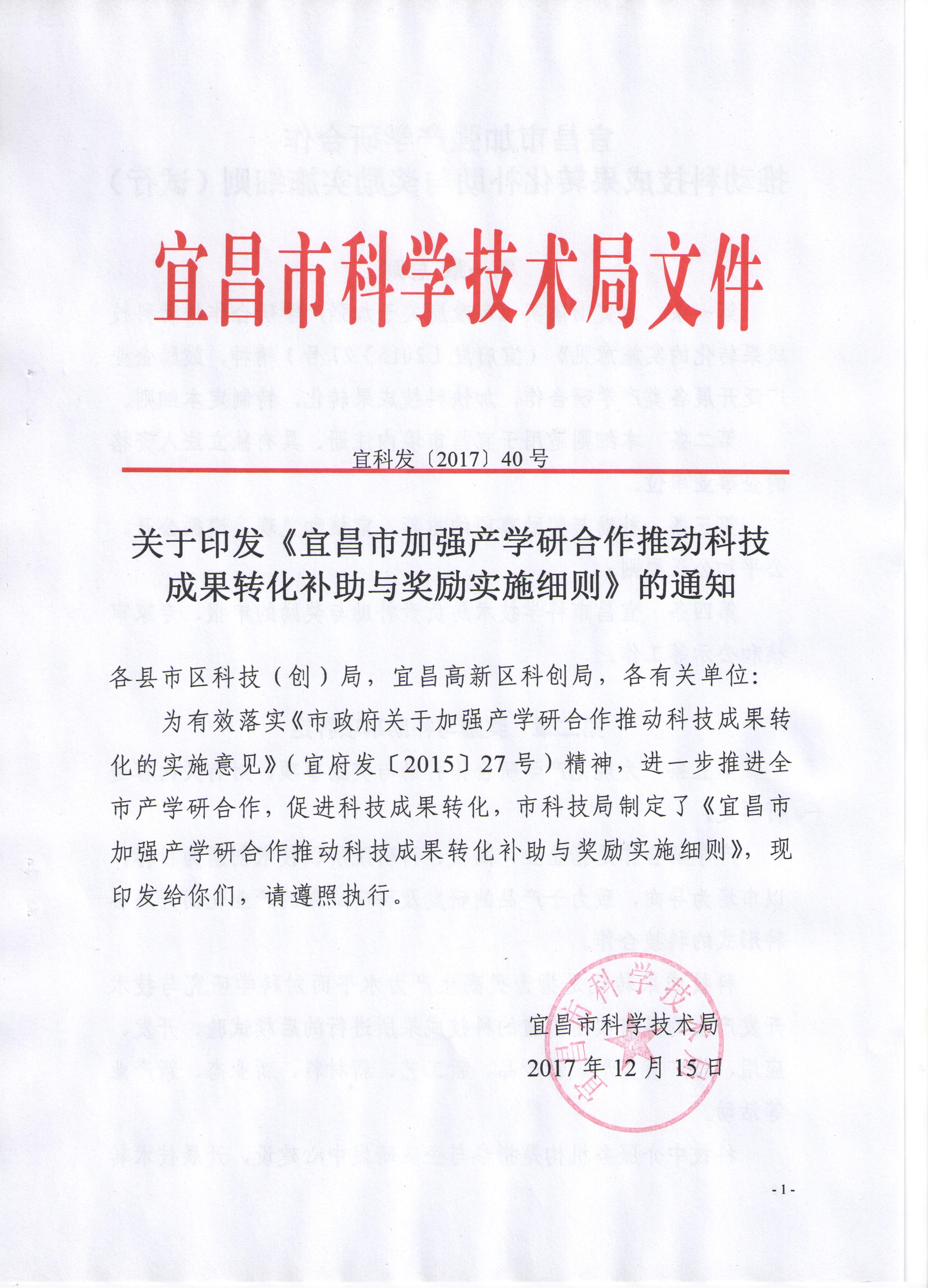 关于印发《宜昌市加强产学研合作推动科技成果转化补助与奖励实施细则》的通知